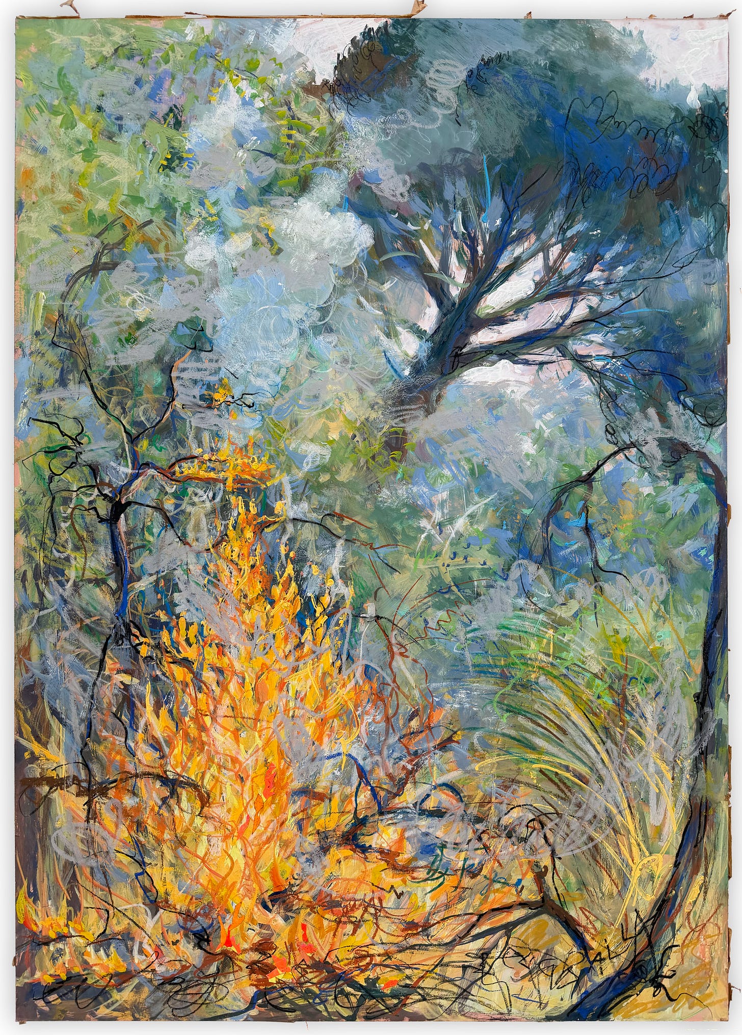 I also experience this from the non-artist side. I collect as well. I just bought a 1973 painting by Elica Balla, the daughter of one of the key figures of Italian Futurism, Giacomo Balla. It’s a beautiful painting of a lush forest with a fire in the middle of it. One thing about Italian Futurism that is often pointed out as problematic is that it was mostly men and kind of bro-y. It also didn’t work out very well – many of its visions of the future can be seen to have contributed to an authoritarian regime, a horrible war, and many people, including important Futurists, dying. So I thought an amazing painting made by Giacomo Balla’s daughter, Elica, in the 1970s — of a burning forest — has a kind of tension that speaks to today. What does the next generation, acting from a more liberal moment, from a different gendered position, do with the tools she developed with her father during the height of the previous regime?