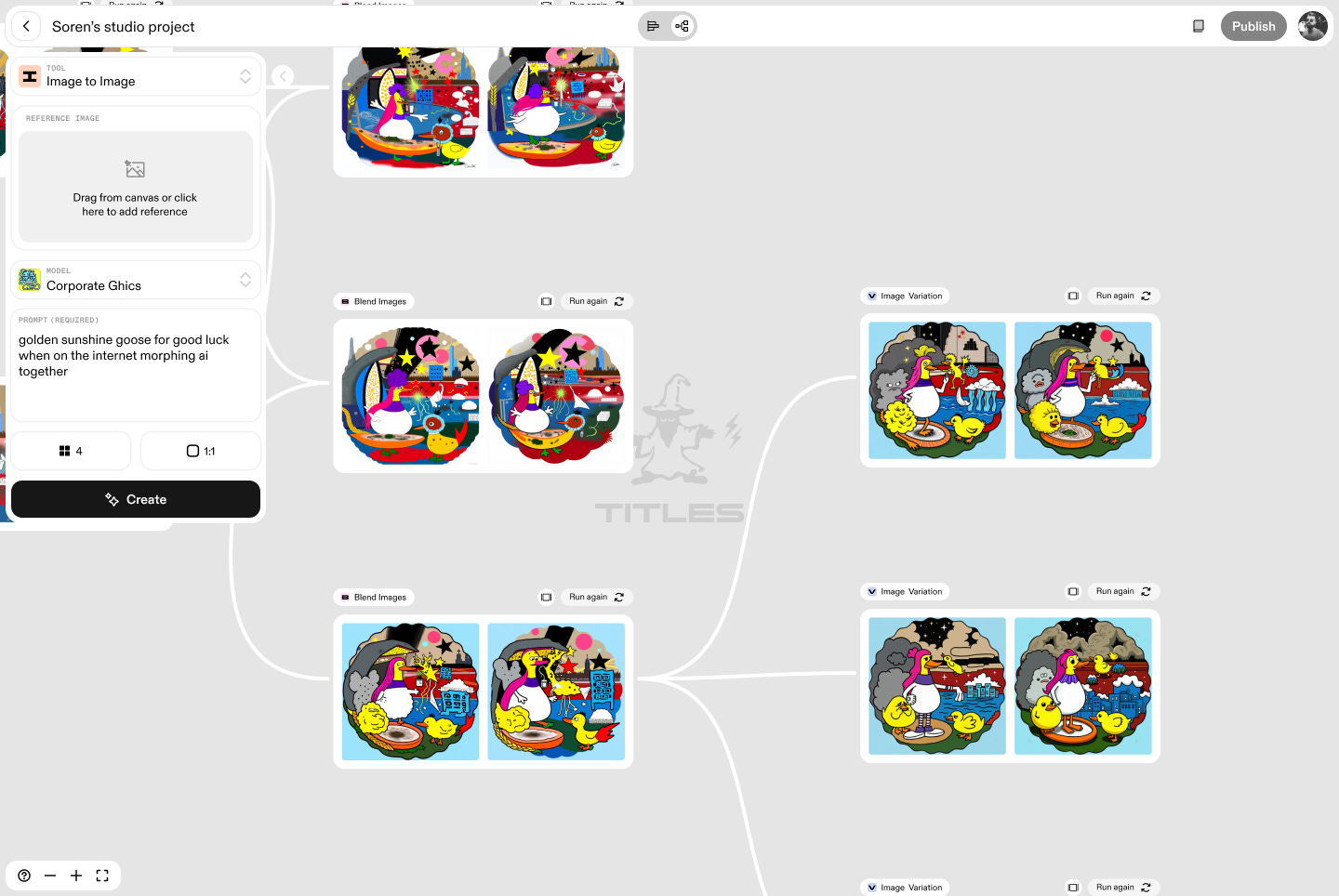 TITLES approaches generation differently. Every generation records which models, parameters, and upstream assets were used. The result is an artifact of not just the output but the process. Think of the mess and iterations inside an artist’s studio. We’re building the digital equivalent, but alive. Others see how you made it. When they build on your technique, that connection is preserved. Payment flows automatically. No negotiation, no invoices, just infrastructure that routes value to creators.