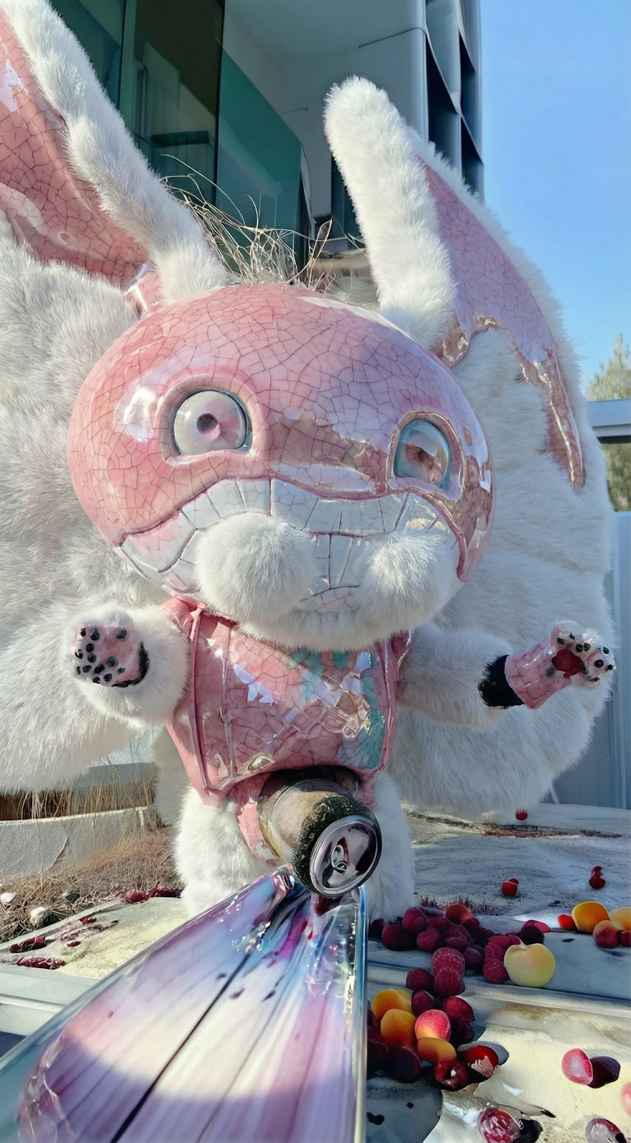 My favorite way of working with AI for media synthesis involves this sort of navigation of concepts and forms: projecting the depth of information of the inner terrain of an organ onto the concept of a tunnel within a shattered plate filled with bats, expressed through the medium of pebbles, candles, frozen jam, and charred blankets. Subtracting the impact craters of lead slugs hitting marmalade from an index of half-finished haircuts abandoned during earthquakes, bludgeoned with speckles of shimmering rose and cornflower retrieved from reflections on a sticky menu in a Malagasy cafe at the edge of a graduation photo — all in service of defining the complex texture of the dent in a mother’s forehead after having a shelf of books topple on her while trying to reach the top row.